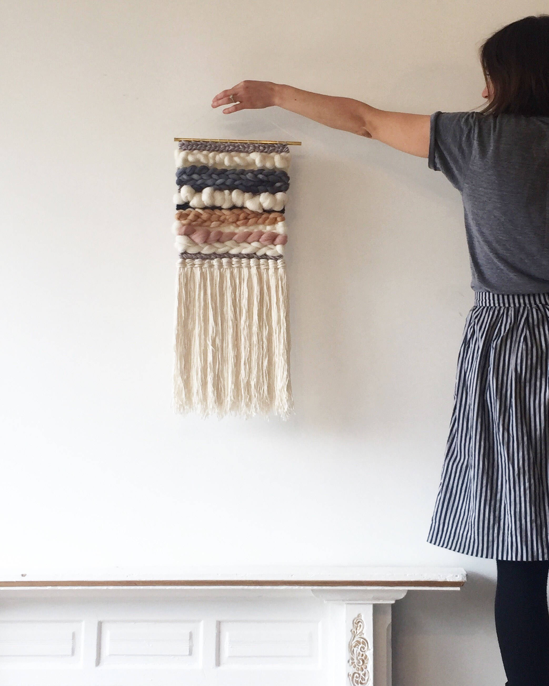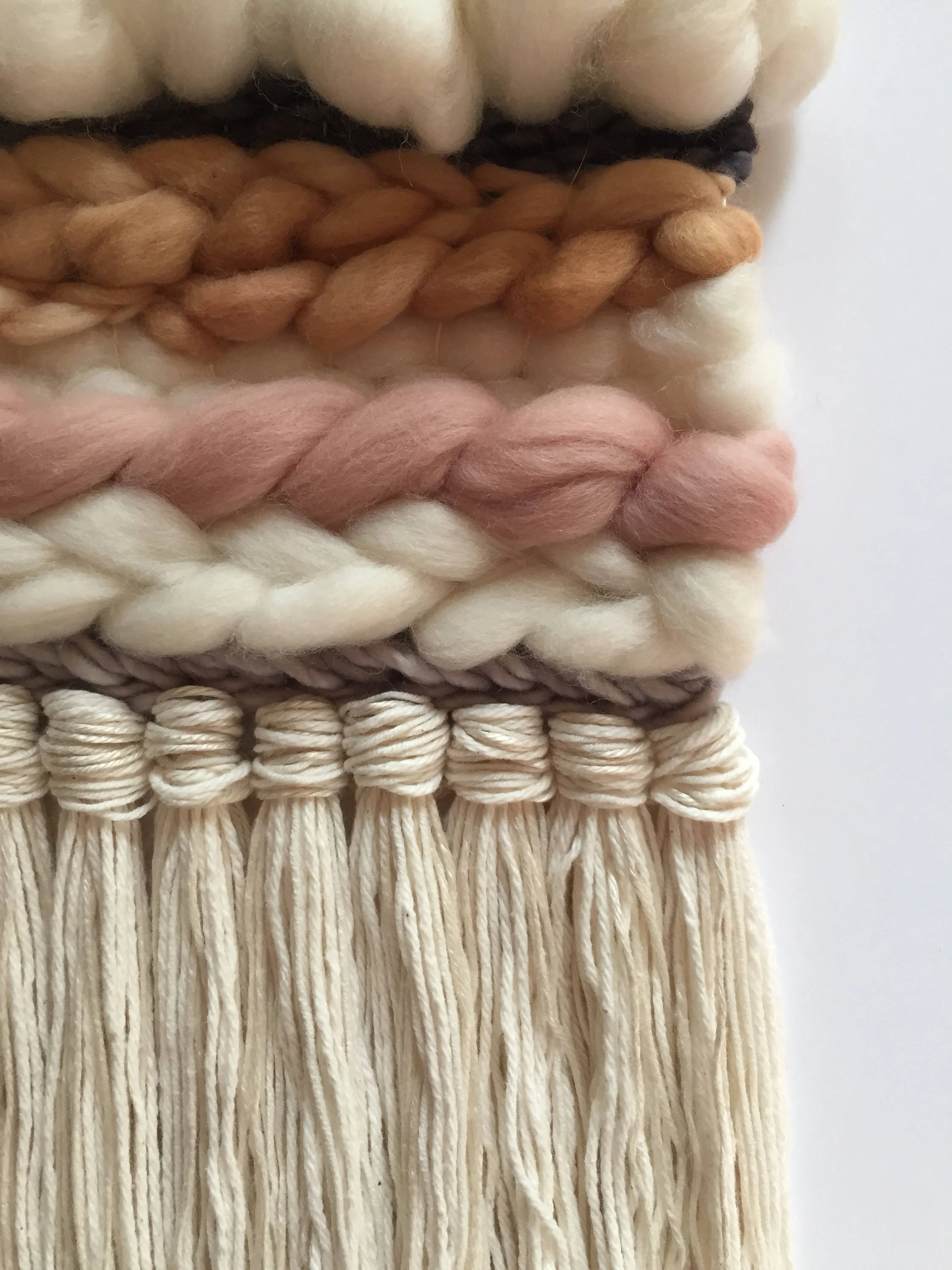 Handwoven wall hanging made from squishy, soft, wool and cotton.