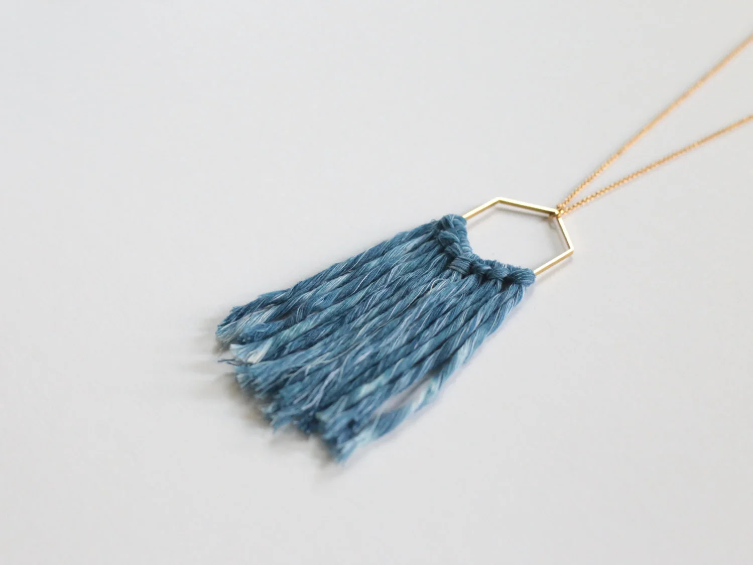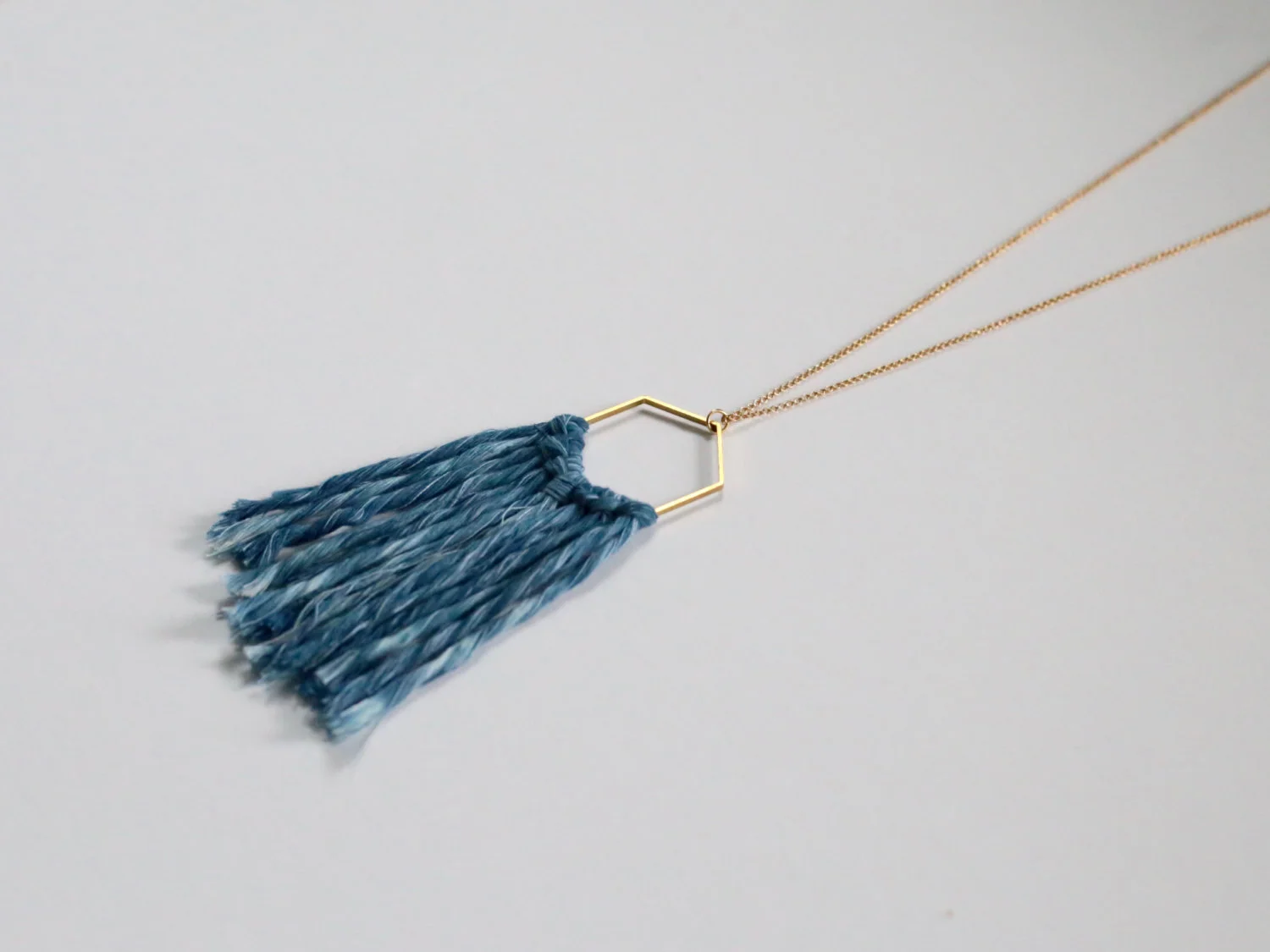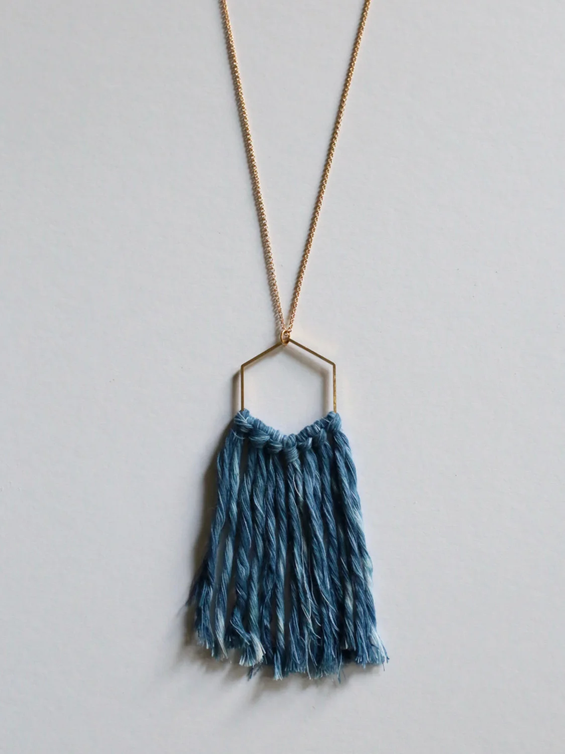 Hand dyed indigo cotton fibers hang from a raw brass hexagon on a gold plated chain. Color may vary slightly from picture as all pieces are unique and have different dye textures.