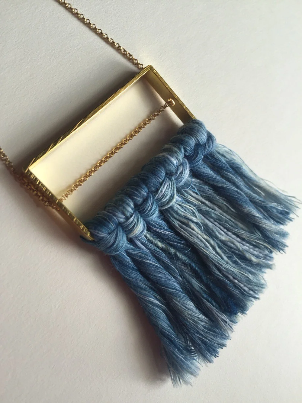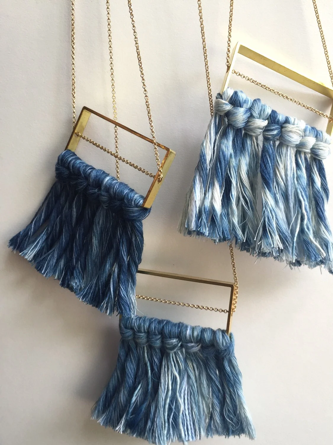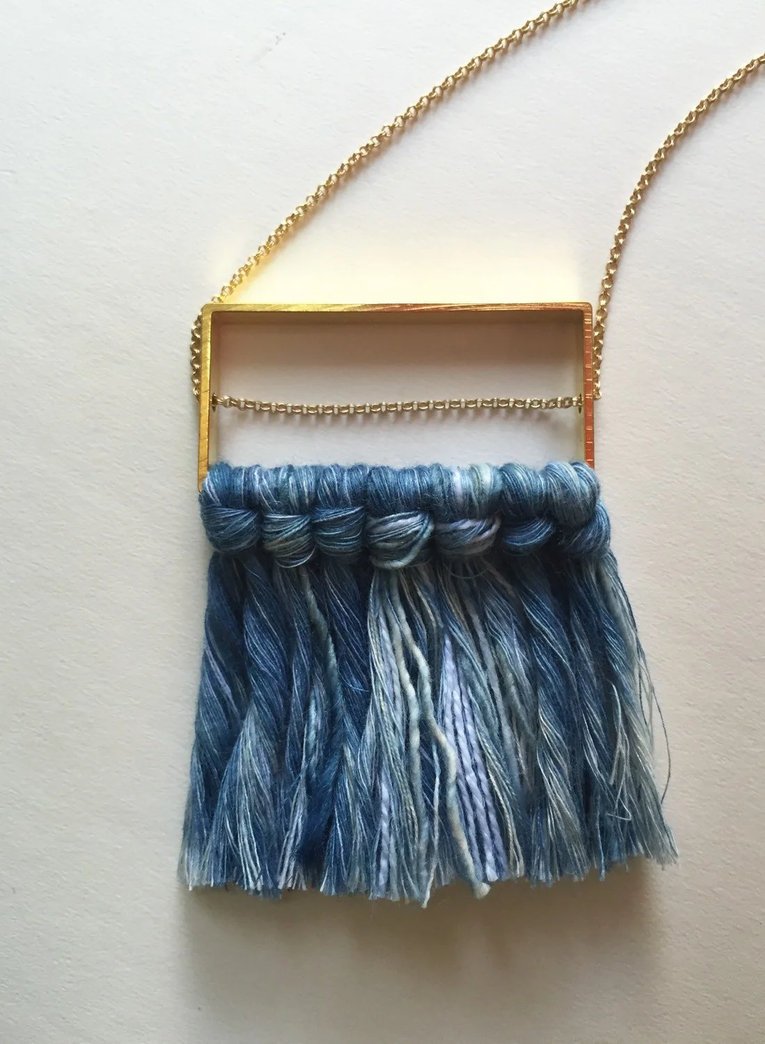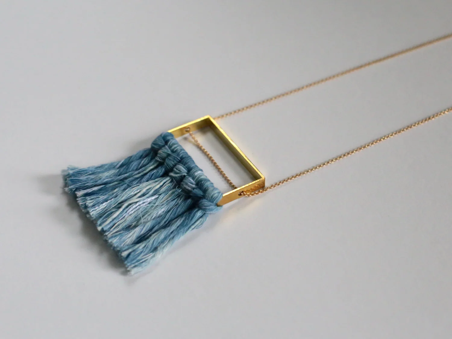Hand dyed indigo cotton fibers hang from a raw brass rectangle on a gold plated chain with clasp. Fiber is a medium indigo, which may vary slightly from picture as all pieces are unique.