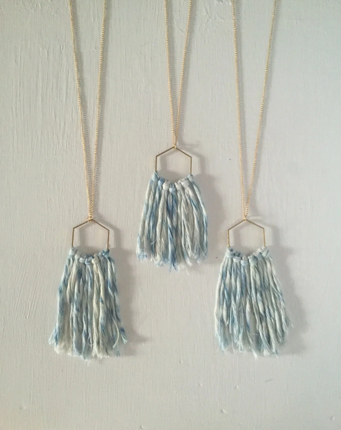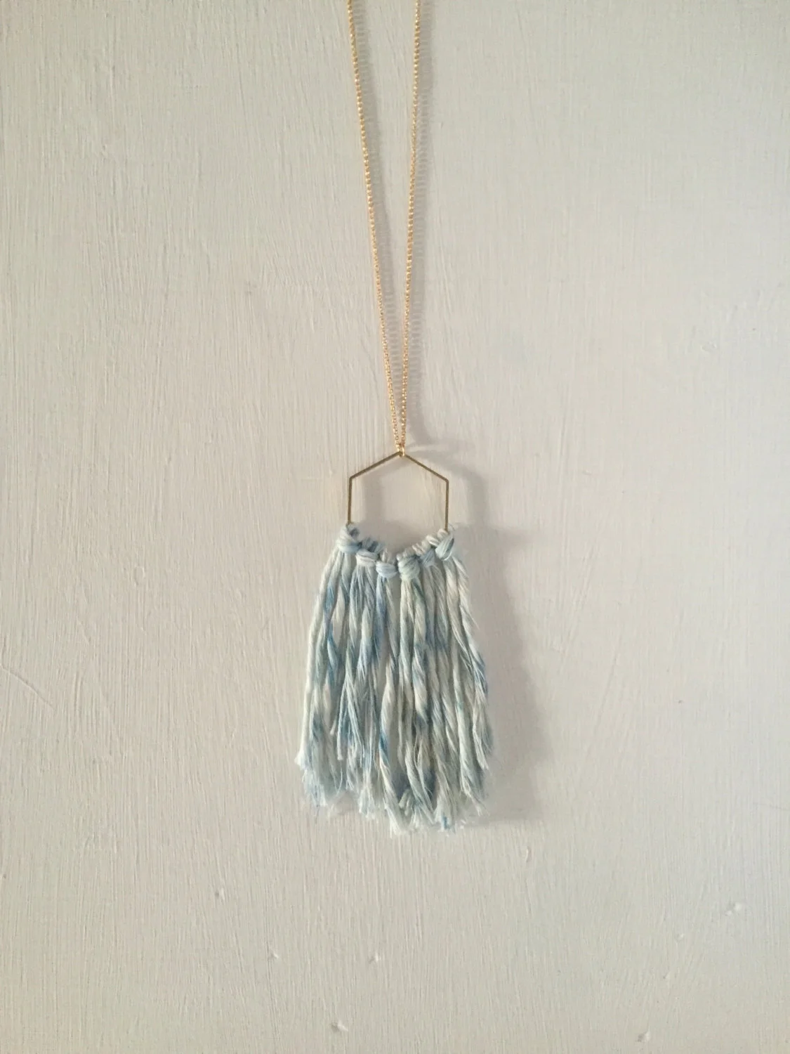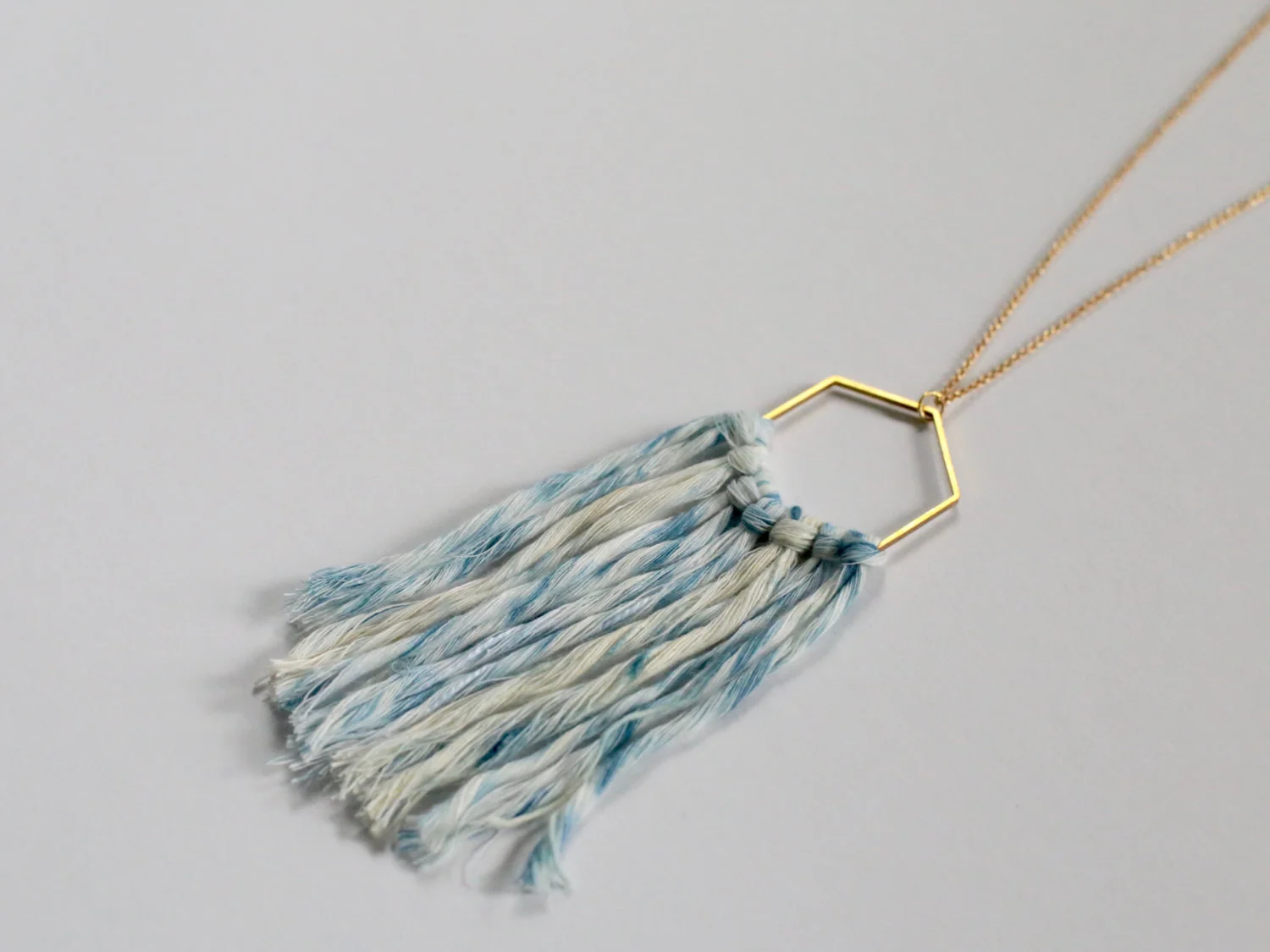 Hand dyed indigo cotton fibers hang from a raw brass hexagon on a gold plated chain. Fiber colors include a range of light wash indigos and white colors. Color may vary slightly from picture as all pieces are unique, see final picture for examples of variation.