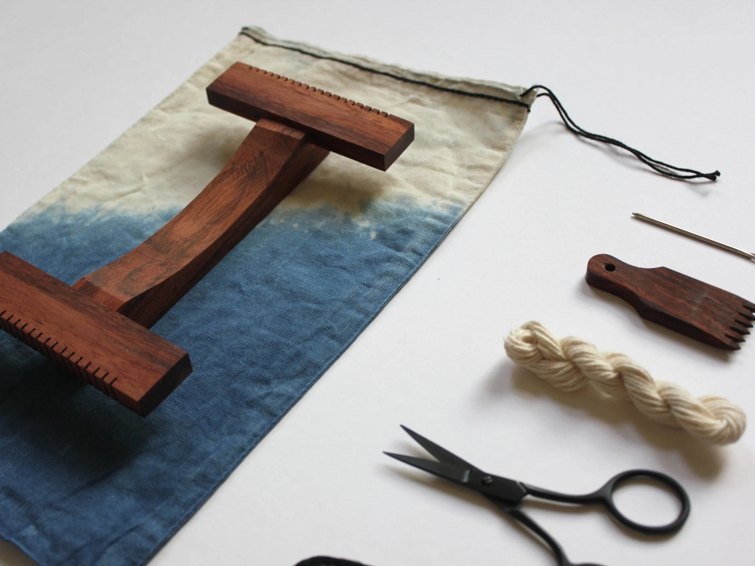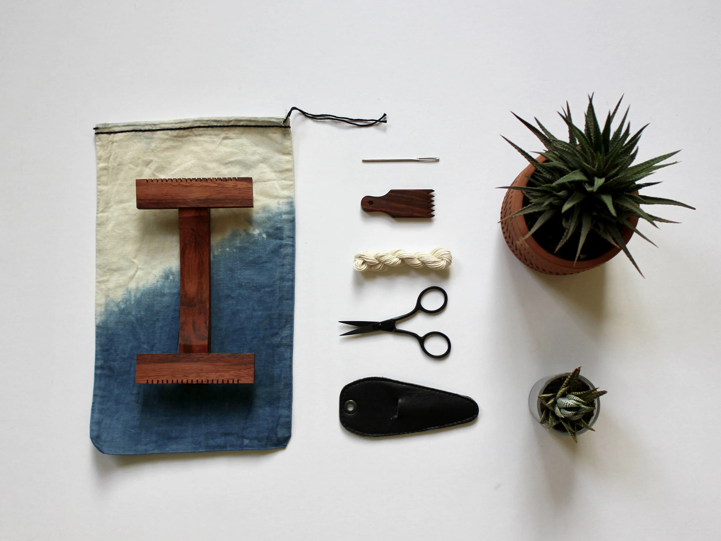 Includes a handmade reclaimed wooden loom and all the weaving tools you could need, including TSA approved scissors in a safety sheath! Throw everything in the indigo dyed pouch for easy transport.