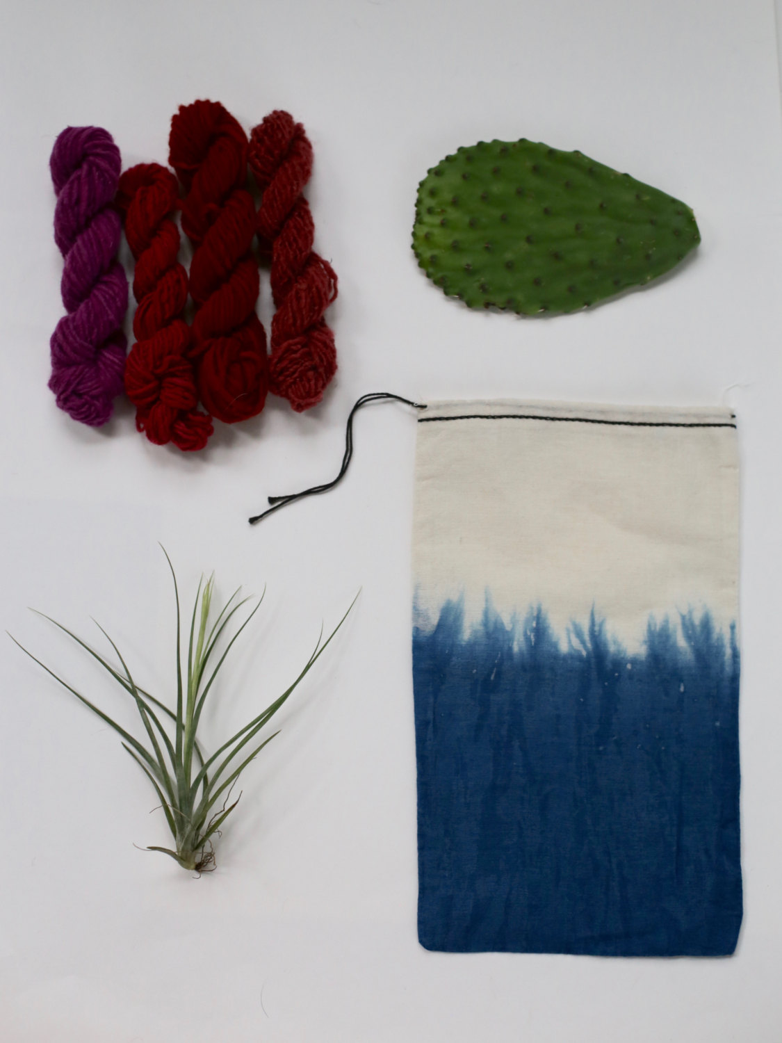 Pack of 4 yarns in an indigo dip dyed organic cotton drawstring pouch. Handspun using traditional tools and naturally dyed by artisans in Oaxaca, Mexico, this yarn is one of a kind and of unique quality. These yarns were dyed with cochineal, an insect that grows on the prickly pear cactus, and is the most sought after red dye in the world.