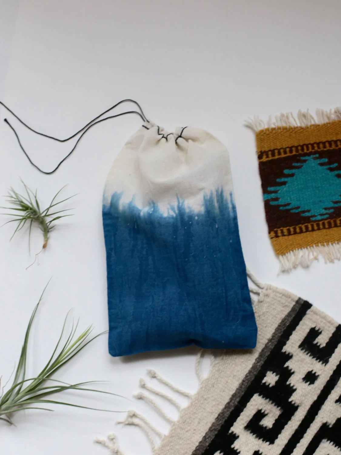 Indigo Dyed Drawstring Pouch measures approx. 11"x 7"