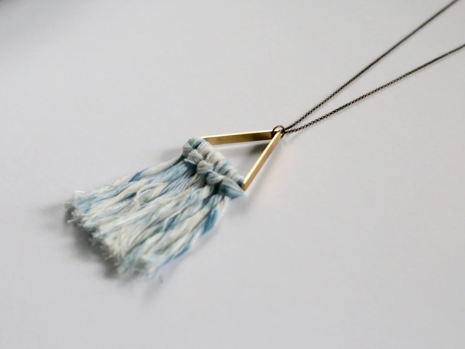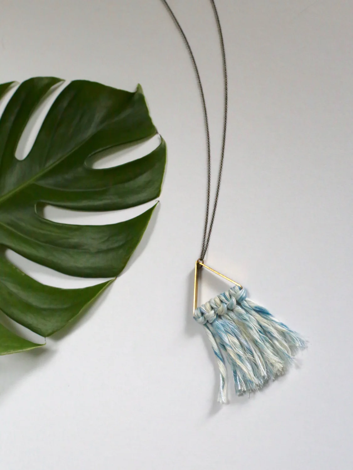 SALE* Light Wash Indigo Fiber Fringe Necklace on Brass Triangle
